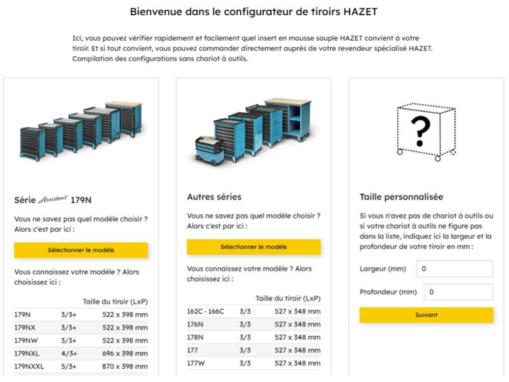 Vous avez une servante d'atelier Hazet et vous souhaitez la garnir de nouveaux outils ? Faites-le simplement et rapidement avec le configurateur d'assortiments pour tiroir Hazet. En quelques clics, choisissez votre modèle ou introduisez simplement la largeur et la profondeur du tiroir et voyez directement comment aménager votre servante d'atelier de manière claire et efficace.