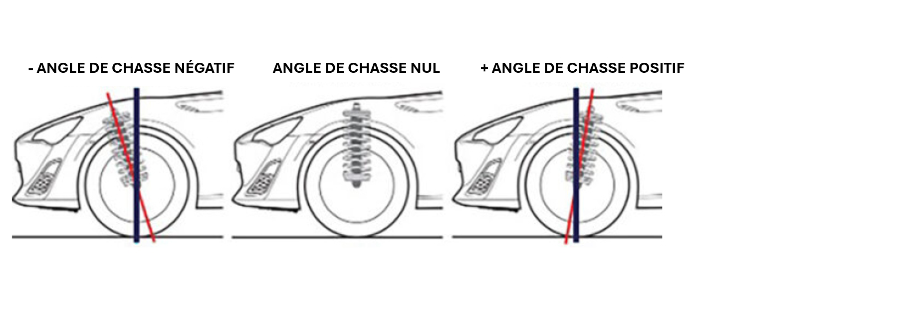 - Un angle de chasse positif assure la stabilité lors de la conduite en ligne droite et le retour automatique du volant après le braquage. Il faut cependant souligner que la direction devient plus lourde.
